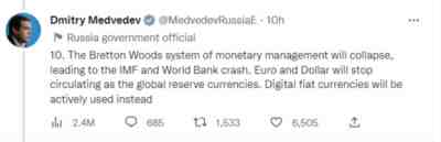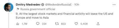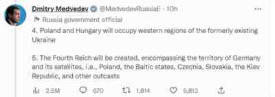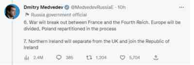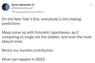 据塔斯社等俄媒报道,梅德韦杰夫给出了10项预测,他对2023年的预测包括: