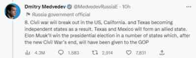 梅德韦杰夫“预测2023”美国内战、马斯克成总统,马斯克回应