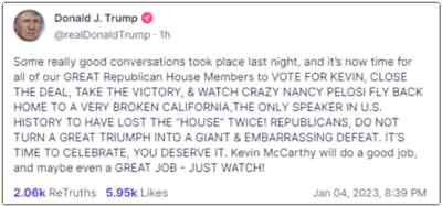 有人说另外一种可能性,就是佩洛西可能会宣布复出,然后有可能凭借票多的优势继续成为众议长。