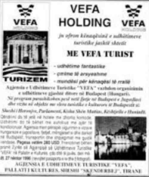 Vefa还赞助了足球队和1996年的阿尔巴尼亚选美比赛。他们拥有广播电台和电视台,并且经常是报纸广告商。从一开始,他们的身份就模棱两可,被看似正式但合法性不明确的合同所混淆。没有实质上的金融监管来干预,他们公开资助政治运动并给政客回扣。