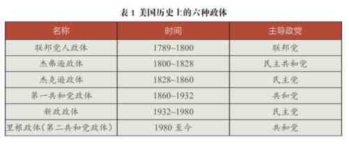 历史分期和政体总结在美国历史和政治研究中并不少见,斯蒂芬·斯克罗内克是其中最有影响的学者之一。在《总统政治》一书中,斯克罗内克把美国历史划分为六种政体,并在此基础上形成了四种总统类型。在斯克罗内克的基础上,巴尔金对政体分期做了进一步细化,如下表所示: