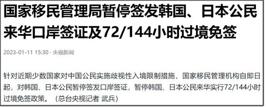 1月11日,“针对近期少数国家对中国公民实施歧视性入境限制措施,国家移民管理机构自即日起,对韩国、日本公民暂停签发口岸签证,暂停韩国、日本公民来华实行72/144小时过境免签政策。”