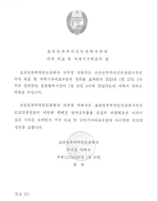 俄驻朝大使馆收到朝鲜外交部礼宾司照会:朝鲜特殊防疫期于1月30日零时结束。真是有惊无险,五天的时间里,朝鲜有效及时控制了疫情扩散。