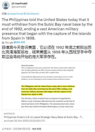 美媒爆料之后,也有人翻出了当时菲律宾告诉美军必须撤出其在菲律宾军事基地的档案。