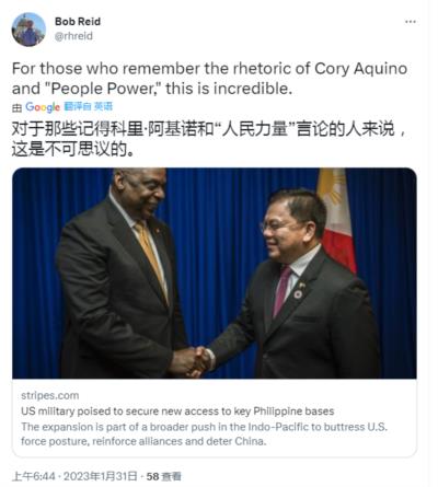 “美国希望在本周达成一项协议,使菲律宾向美军开放多达四个军事基地。”“预计最快在本周美国国防部长奥斯汀访问菲律宾时宣布。”