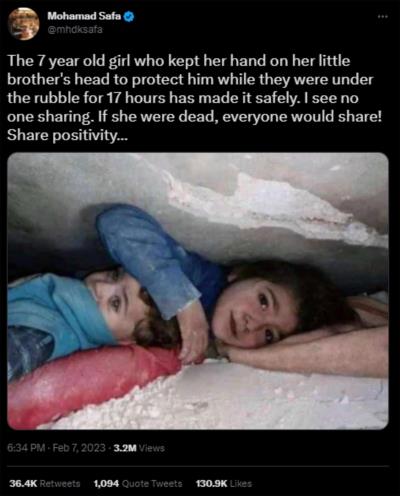 在照片与视频里,显示一个年仅7的小女孩和她年仅2岁的弟弟被压在瓦砾之下17个小时,却仍勇敢的用手臂保护弟弟。在救援人员解救这对不幸而又万幸的姐弟时,年仅7岁的小女孩对救援人员说出“如果救我们出去,我们愿意给你当仆人”。