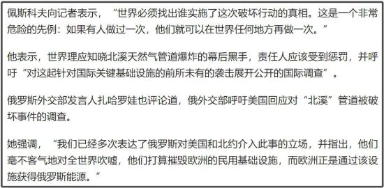 俄罗斯佩斯科夫表示,“世界必须找出谁实施了这次破坏行动的真相。这是一个非常危险的先例:如果有人做过一次,他们就可以在世界任何地方再做一次。”