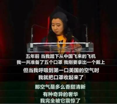 2017年5月21日,美国马里兰大学的夏季毕业典礼上,杨舒平代表中国留学生发言:当我呼吸到美国第一口空气时,那空气是如此的香甜清新,有种奇异的奢华,我完全被震惊了......