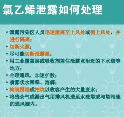 氯乙烯发生泄露后的正确处理方法、流程,是人员快速撤离、隔离,切断火源、切断泄露源,盖住附近下水道,以通风加速扩散,喷雾稀释、溶解等。