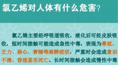 氯乙烯是一种剧毒气态化学物质,接触氯乙烯可能会引起头晕、嗜睡和头痛,严重时导致死亡,长时间吸入氯乙烯可能引发脑癌、肺癌和某些血液癌症。
