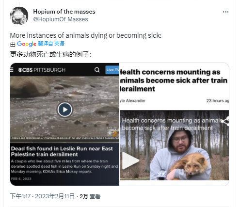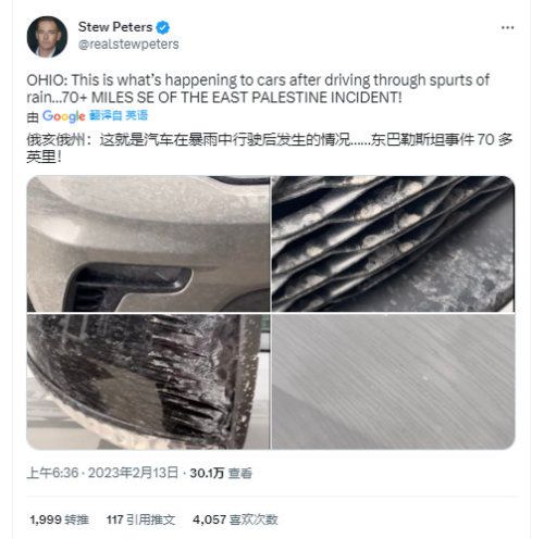 因氯乙烯燃烧事件,俄亥俄州东巴勒斯坦镇的居民被紧急疏散。可没多久后,这些居民就被带了回来。当地政府称,一切都是安全的。可当居民回家后却发现,家里的空气中有着明显的刺鼻味,100英里外出现了死鱼、死牛,70英里外的汽车也出现了被腐蚀的现象。