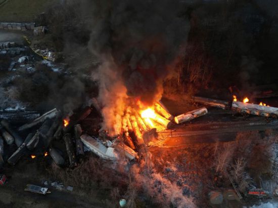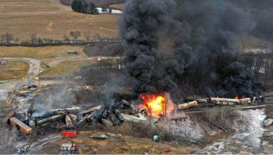 在美国俄亥俄州,一辆装载着10万加仑氯乙烯的火车脱轨,导致了严重的氯乙烯泄露事件。这是一辆100节的列车,其中50节脱轨,20节装载的是化学危险品,5节车厢装载的是危害巨大的氯乙烯。