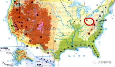 美国山川河流图、红圈为事发地