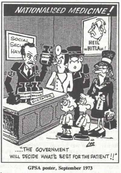 实际上,从1973年开始,医生组织就极力反对 Medibank,而专家们则抵制它的实施。AMA 的宣传将该计划等同于“国有化医疗”,并营造了这将是一个专制制度的观点——在这个制度中,每位患者都将被视为一个简单的数字。Medibank 的反对者声称,患者和医生的自由将受到威胁,而 AMA 断言该计划只是工党“社会化”计划的开始。澳大利亚的全科医生协会(一个获得超大声望的小组织)走得最远,在一张海报中将工党的健康计划与纳粹控制进行了比较,海报描绘了穿着党卫军制服的社会保障部长比尔海登。少数支持 Medibank 的医生组织了自己的医生改革协会来支持它,但他们的影响程度尚不清楚。市场研究表明,AMA 已经传达了关于国有化的信息,但支持“国有化医药”的人还是多于反对它的人。