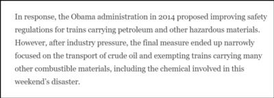 在行业压力下,2015年奥巴马最终颁布的新规仅仅只对原油运输做了限制,而许多其他易燃易爆的危险化学品都纷纷得到了豁免,其中就包括本次事故中所涉及的多个化学品,给危险化学品长途运输大开绿灯。