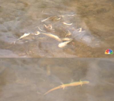 一对住在距火车脱轨地点约5英里(约合8公里)的夫妇称,他们在当地河流中发现了数百条腹部朝上的死鱼。
