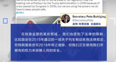美国政府的交通部长则直接把锅甩给了前总统特朗普,指责特朗普政府在5年前废除了一项铁路安全法规导致了此次列车脱轨。