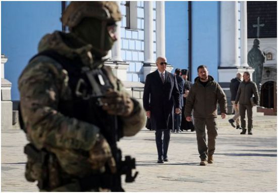 乌克兰首都彼时处于安全封锁状态,汽车交通停止,甚至行人也被挡在某些街道之外。据路透社报道,在拜登的行程中,基辅响起了空袭警报。
