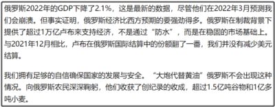 经济方面,普京也坦诚俄罗斯2022年的GDP下降了2.1%,但普京认为,“俄罗斯经济比西方预期的要强劲得多。”“卢布在俄罗斯国际结算中的份额翻了一番”。