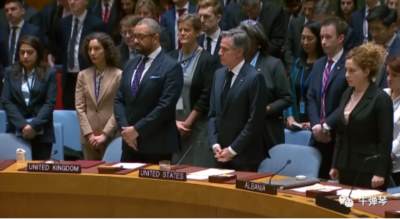 大概僵持了20秒钟,古特雷斯、布林肯等人才都站起来,开始正式默哀仪式。