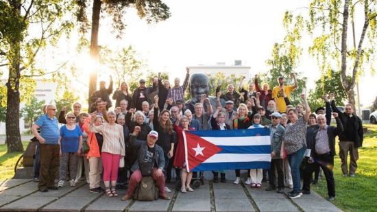 (2022年党代会期间,芬兰共产党成员在科特卡的列宁雕像前)