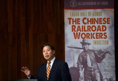 2014年5月9日,在华盛顿美国劳工部,时任美国劳工部副部长卢沛宁出席纪念仪式。当日,美国劳工部举行纪念仪式,正式将19世纪在美国修筑铁路的1.2万名华工载入其荣誉榜。新华社记者殷博古摄
