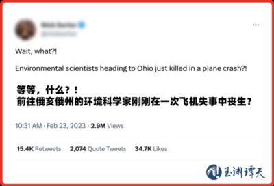 不久前,一架载有5名环境顾问的飞机在前往俄亥俄州的路上坠毁。很快,这件事就在社交媒体上发酵,谭主注意到,热度最高的一条帖子,用的词,是环境顾问“被杀”。