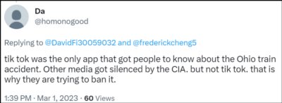 “TikTok是唯一一个让人们知道俄亥俄州火车事故的APP,除了TikTok其他媒体都被CIA噤声了,这就是他们要封禁TikTok的原因。”