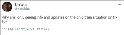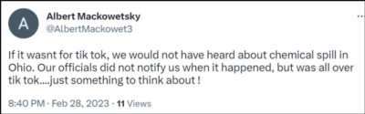 以及:“如果没有TikTok,我们就不会听说俄亥俄州的化学品泄漏事件。我们的官员在事情发生时没有通知我们,但这件事已经传遍了TikTok....这是一件值得反思的事情!”