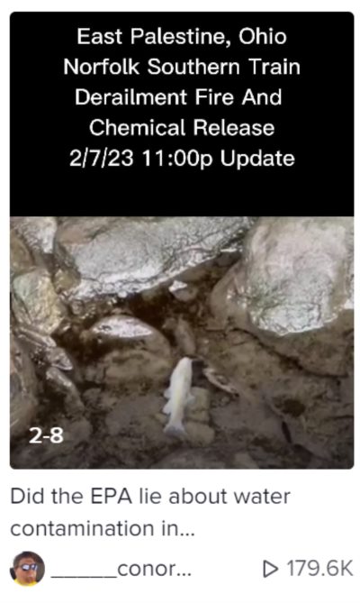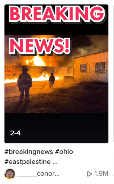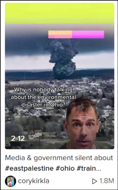 并且在推特脸书等社交平台上,流传的很多俄亥俄州有毒化学品泄漏的画面和视频,都是从TikTok上流传过来的。