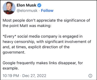 去年12月底,马斯克曝光了美国政府干预社交媒体的内幕,称所有社交媒体平台都与美国政府合作,对内容进行审查,有时政府还会发出明确指示,比如让谷歌删除一些指定链接。