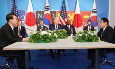 因此,在安全、经济的复合危机中,韩国政府的目光不仅投向日本,更投向后面的美国。于是递上了“投名状”,通过改善韩日关系来实现美国加强韩美日合作的“夙愿”。