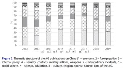 原初的愿景在话语上得到了很好的体现。2012-2019年间,NG上发表的有关中国的文章数量从每年两百多篇上升到了每年六百多篇(图1)。其中大多数文章不仅把中国看作是邻居和伙伴,还把中国看作国际政治领域一个主要的行为者。这些文章主要聚焦于经济和外交政策的话题,但关于中国国内事务的新闻也不时出现。