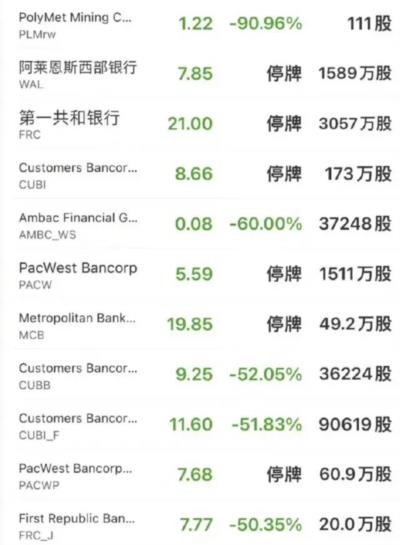 美稀宗拜登刚刚宣称:“美国人民可以相信银行系统是安全的”……果然言出法随,一小时后美国银行股大跌,第一共和银行暴跌67%,阿莱恩斯西部银行跌75%,西太平洋合众银行跌约35%,阿莱恩斯西部银行、第一共和银行均停牌,西太平洋合众银行触及熔断。