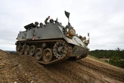 当地时间2023年2月23日,英国,乌克兰志愿军在英格兰南部的一个军事基地接受挑战者坦克训练。图源:视觉中国