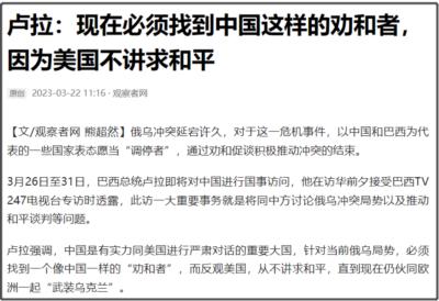 卢拉还说了一段比较直接的话,他称“中国是有实力同美国进行严肃对话的重要大国,针对当前俄乌局势,必须找到一个像中国一样的“劝和者”,而反观美国,从不讲求和平,直到现在仍伙同欧洲一起“武装乌克兰”。