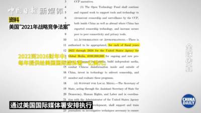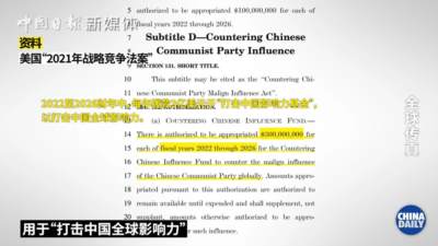 2021年4月,美国通过所谓的“2021年战略竞争法案”,提出于2022至2026财年每年拨款3亿美元用于“对抗中国在国际上产生的影响”。