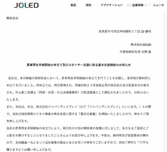 JOLED同时提到,尽管公司多次筹集资金并努力提高收益,但预计若业务继续下去,将很难提高Nomi工厂和千叶工厂的提款成本,因此提出申请,要求启动民事康复程序。
