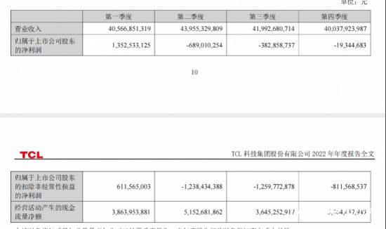 而且南都湾财社记者梳理发现,TCL科技除了2022年第一季度外,该年度其余三季度,无论归属于上市公司股东净利润或者归属于上市公司股东扣非净利润,均为负数。对于大幅亏损的原因,TCL科技表示报告期内,受全球经济下行影响,终端需求下降,大尺寸面板产品价格大幅下降,半导体显示产业经营业绩在底部徘徊。