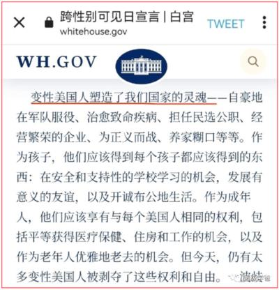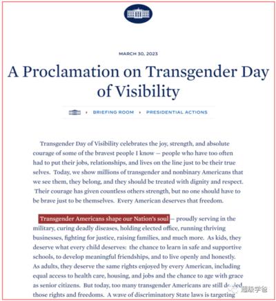 咱不瞎说,就在几天前的3月30日,美国总统拜登发表了一篇公告,说变性美国人塑造了国家的灵魂。拜登不是老糊涂了,因为公告是以文字的形式发表在白宫官方网站。