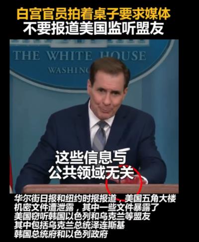 其次,美国白宫国家安全委员会战略传播协调员约翰·柯比在昨天的记者会上,可是急的拍桌子了,要求媒体不再报道此次监听丑闻,声称美国监听丑闻这些事不能让公众知道。