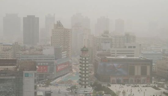 2023年4月12日,郑州,扬沙浮尘天气下的二七纪念塔。