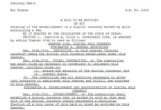 近日,美国得克萨斯州两位立法者,参议员布莱恩·休斯和众议员马克多·拉齐奥,提出了两项法案,准备创建一种由州发行,可以兑换成美元现金或黄金的数字货币。