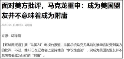 面对美国方面的批评,马克龙并没有改口,在4月12日,马克龙重申,成为美国的盟友并不意味着要成为他们的“附庸”。