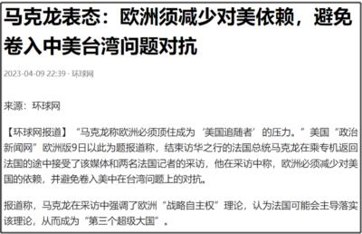 法国总统马克龙,在这次访华后,回国途中就接受采访时称,“欧洲必须减少对美国的依赖,并避免卷入美中在台湾问题上的对抗。”