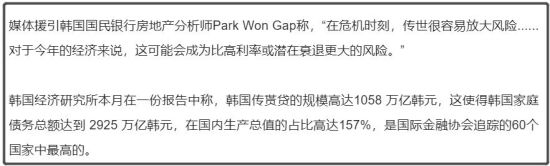 韩国经济研究所的报告数据显示,韩国全租房贷款规模高达1058万亿韩元,折合约7900亿美元,加上这么庞大全租房贷款规模,韩国家庭债务总额达到2925万亿韩元,占韩国GDP比值达到157%。