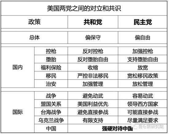 近日,美国知名时事评论员Ksliu发表了一篇题为《美国的两党政策:分裂、对抗和共识》的文章,分享了一张《美国两党之间的对立和共识》图表,显示美国共和党、民主党对控枪、堕胎、福利保险、移民、治安、战争、盟国关系、台海战争、乌克兰战争和中国等十大问题的态度,其中9个问题两党存在明显分歧,唯独在对待中国的态度上高度一致——“强硬对待中国”。