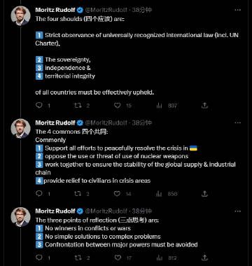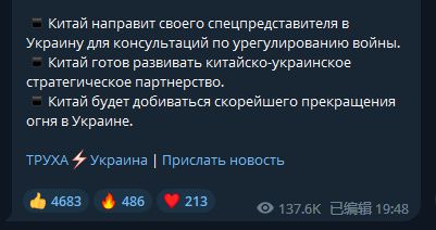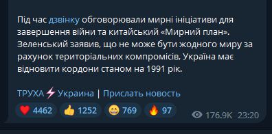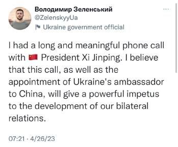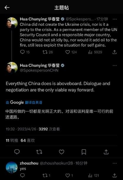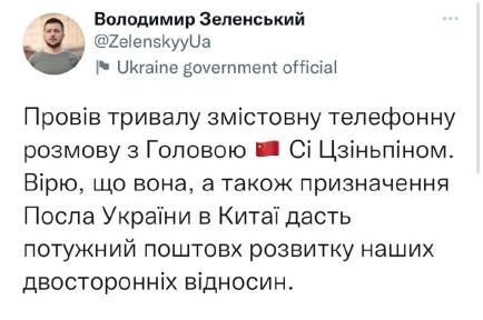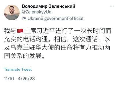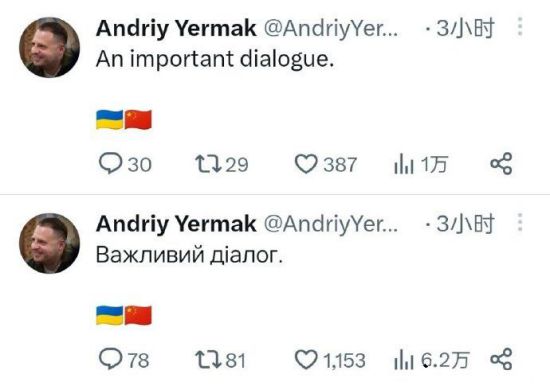 乌克兰总统办公室主任叶尔马克说:“这是一次重要的对话。”而且是连发两条,并附上中乌两国国旗。他还表示,在乌克兰和中国的和平计划里找到了共同点。