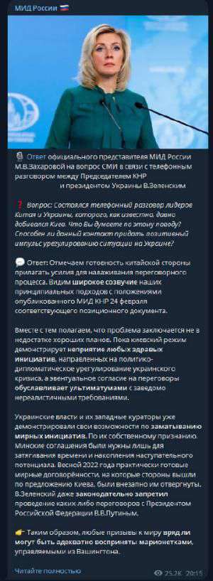 俄罗斯政府第一时间发布了外交部发言人玛丽亚·扎哈罗娃,关于此事答记者问的全文。第一条就明确表示:“我们注意到中方愿意为建立谈判进程作出努力。我们看到我们的原则性做法与中国外交部2月24日发表的相关立场文件之间有广泛的一致性。”
