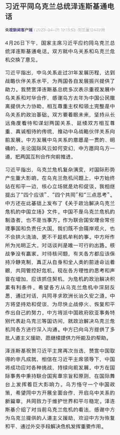 中方同泽连斯基说了啥?官方通稿全文太长,戎哥斗胆给大家划划重点,白话翻译一下: